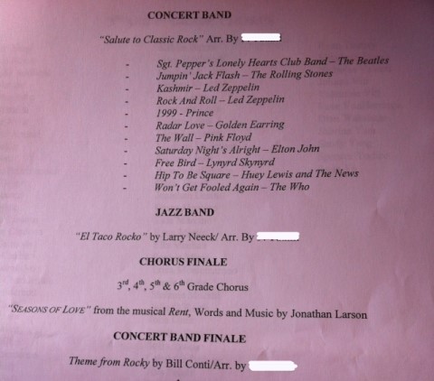 They seriously do. And not just because my own kids are in them (because, despite the general drudgery of a concert, it IS adorable to watch your own child perform). No. The concerts are amazing because both the music teacher and the band director put on a show that by far eclipses every crappy school concert my parents were forced to attend. I pity my folks, because they had NO idea how much better it could all be.