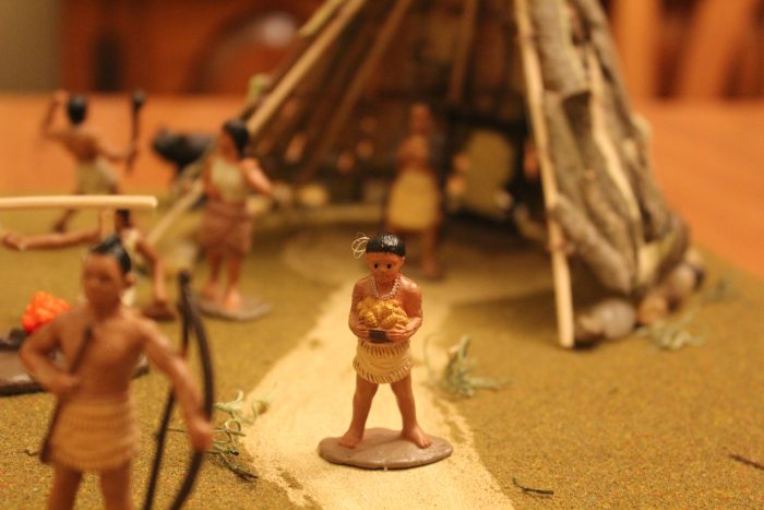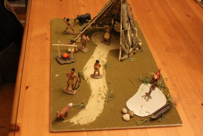 We made the return trip to the craft store, where we acquired all means of tiny Native American figurines, grass paper, some bark-like wreath thing, and too many dollars later, hauled our goods home.
